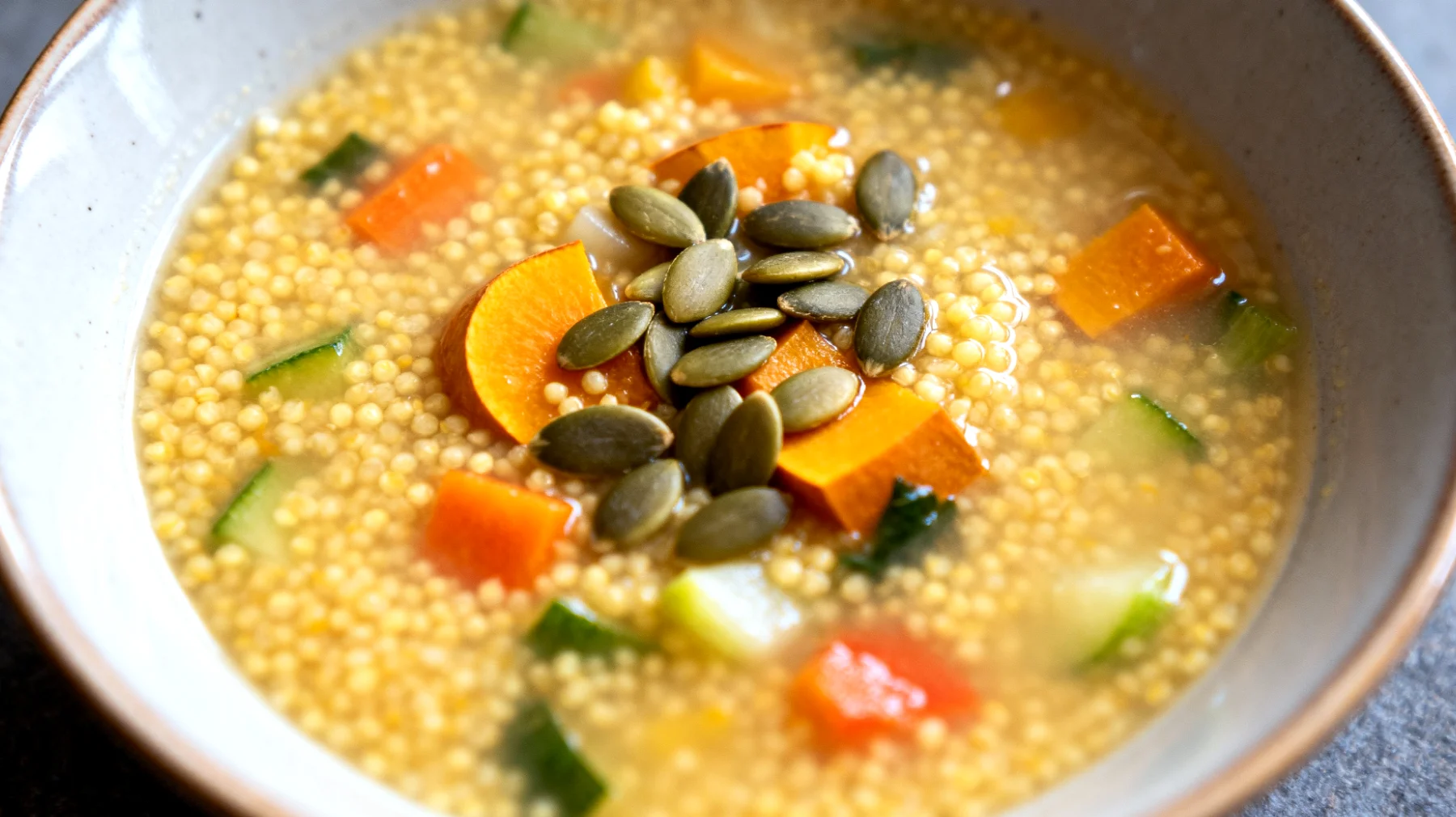 La zuppa di miglio con verdure e semi di zucca rappresenta una scelta nutrizionalmente equilibrata per chi desidera concludere la giornata con un pasto che nutra senza appesantire. Il miglio è un cereale antico, privo di glutine, con un buon contenuto di carboidrati complessi, fibre, vitamine del gruppo B e minerali come magnesio, fosforo, ferro e potassio, che lo rendono utile per chi pratica attività fisica e svolge lavori mentalmente impegnativi.