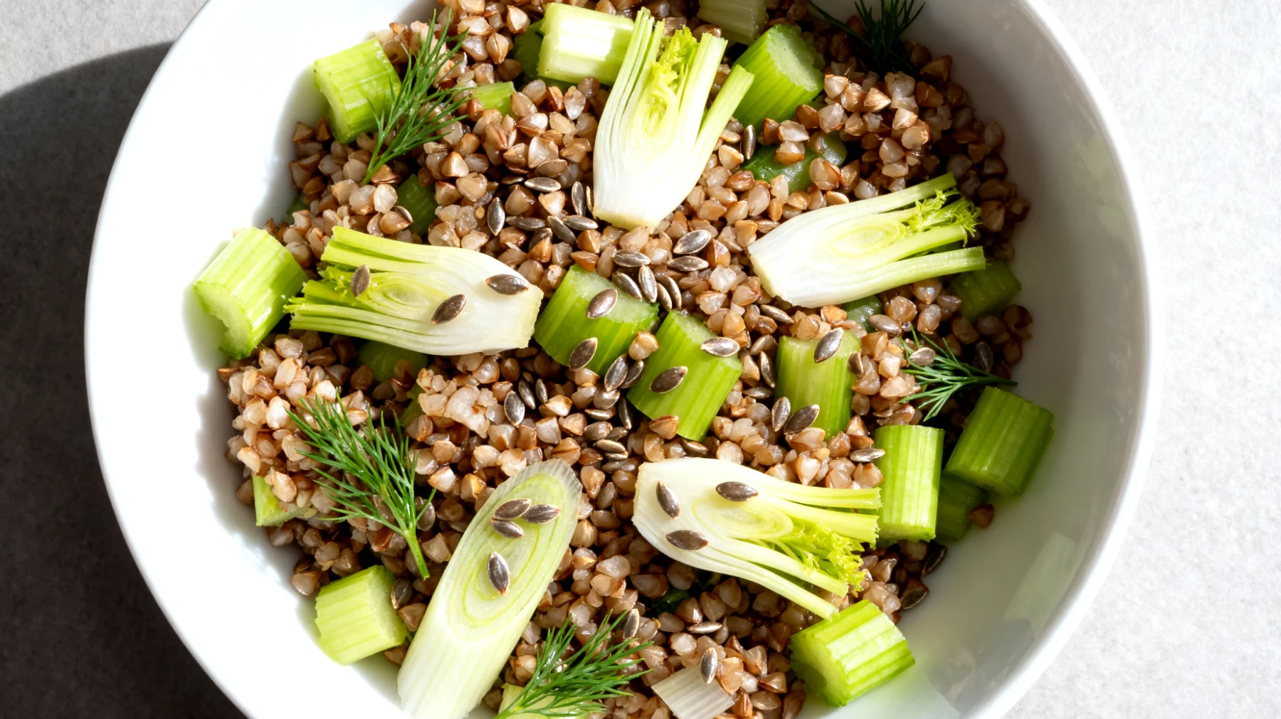 La risposta non arriva dai diuretici né dalle insalate tristi e monotone, ma da una combinazione intelligente di ingredienti funzionali che lavorano in sinergia. Ed è qui che entra in scena un piatto pensato proprio per chi vive la giornata alla scrivania: grano saraceno con sedano, finocchi e semi di lino, un’insalata che contrasta gonfiore e stanchezza con una strategia nutrizionale precisa.