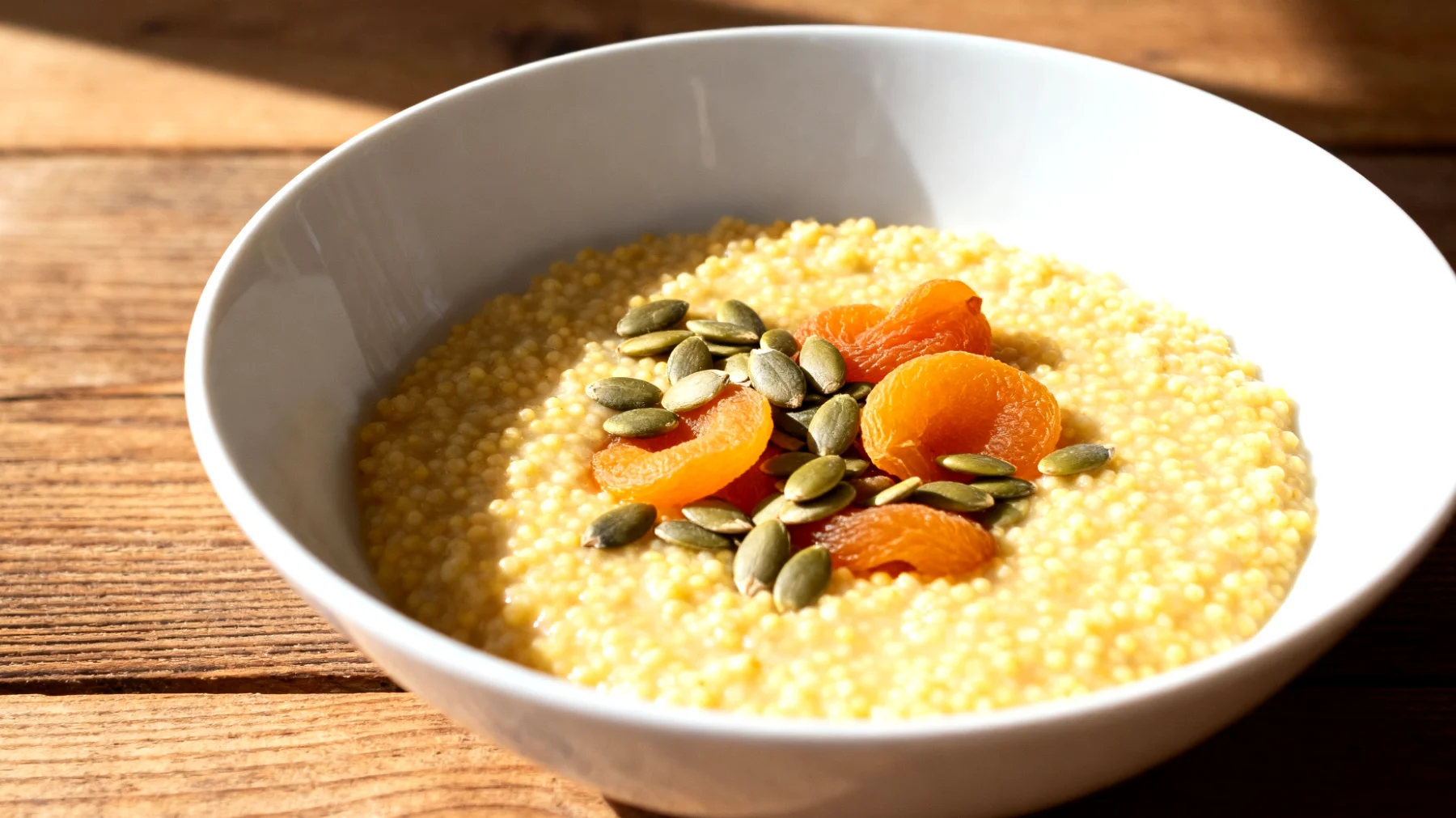 Cuoci per 20-25 minuti a fuoco medio-basso, mescolando occasionalmente. Aggiungi i semi di zucca negli ultimi minuti di cottura per preservarne le proprietà , e guarnisci con albicocche secche tagliate a pezzetti quando il porridge è ancora tiepido. Servito tiepido anziché bollente, favorisce una digestione ottimale senza richiedere eccessiva energia al sistema digerente.